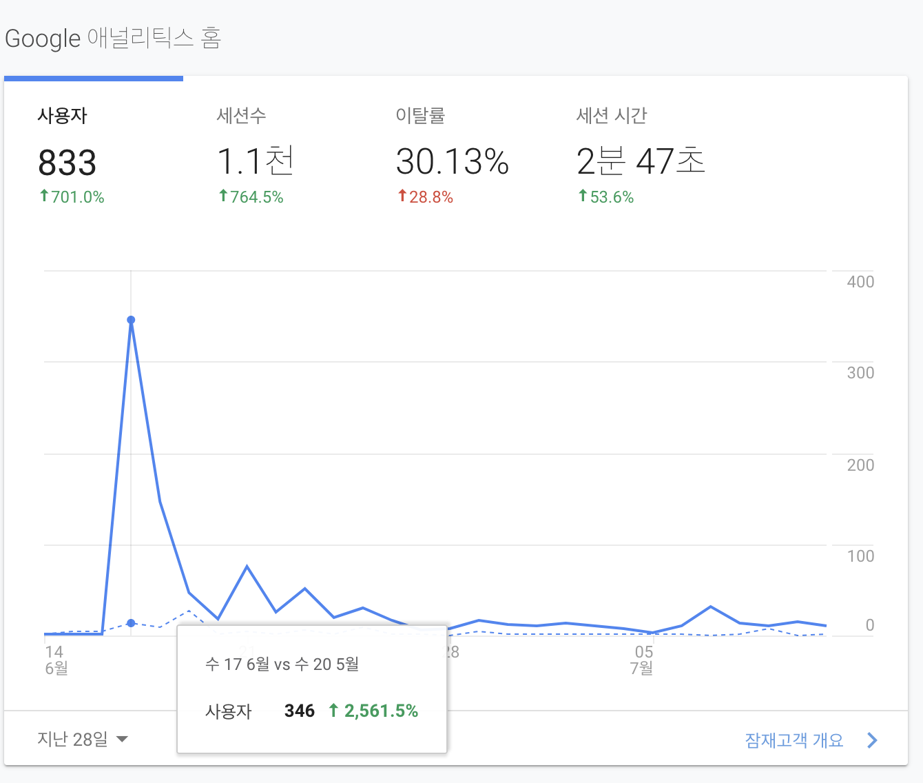 모인 데이터를 상세하게 읽는 방법은 모르지만, 단순하게는 DAU부터 이탈율이나 어떤 걸 검색해보는지 url을 통해 확인해볼 수 있어 흥미로웠습니다. 무료 툴이고, 제 기억으로는 main 페이지의 html 코드의 헤더에 구글 애널리틱스에서 제공하는 코드를 붙여넣으면 바로 연동이 되는 것으로 알고 있습니다.