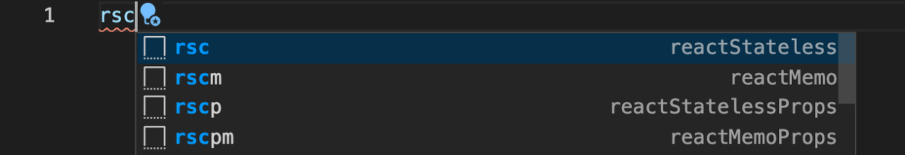 VS Code를 사용해보면 종종 무의식 중에 사용하는 자동완성 코드가 많습니다. 개인적으로 프론트엔드 개발을 하면서 종종 사용한 것들이 rsc, for 등인데, 해당 문자열만 입력하면 VS code가 자동으로 템플릿을 불러올 수 있게끔 드롭다운 메뉴*가 등장합니다. 대표적으로 리액트를 사용하면서 rsc 스니펫을 불러오면 아래와 같이 코드 템플릿이 완성됩니다.