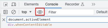 반복적으로 찍어보고 있는 값이 있다면 live expression 을 통해 실시간으로 값을 트래킹 할 수 있다. 예로, activeElement는 유저의 인터렉션에 따라 계속해서 변화할 수 있는 값인데, live expression을 이용하면 실시간으로 변하는 값을 간단하게 확인할 수 있다. 필요에 따라 여러 개를 추가할 수 있다.