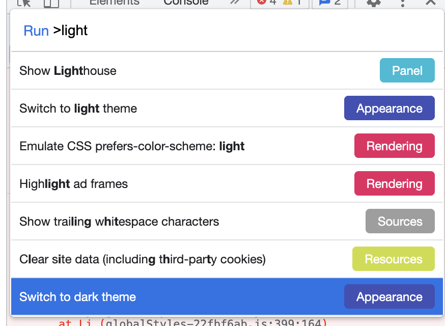 VS Code처럼 개발자 도구에서도 메뉴를 빠르게 찾거나 파일을 여는 걸 command menu를 통해 실행할 수 있다.